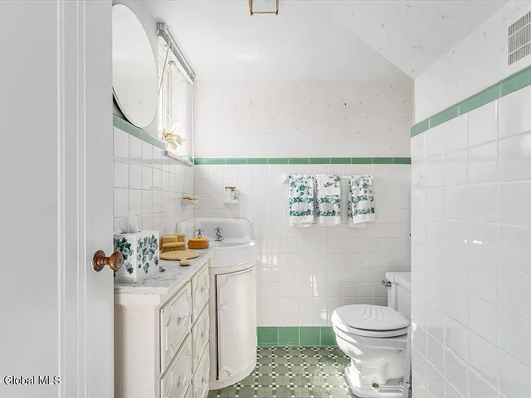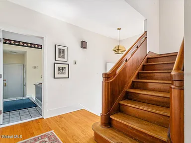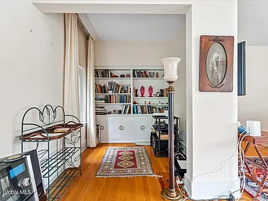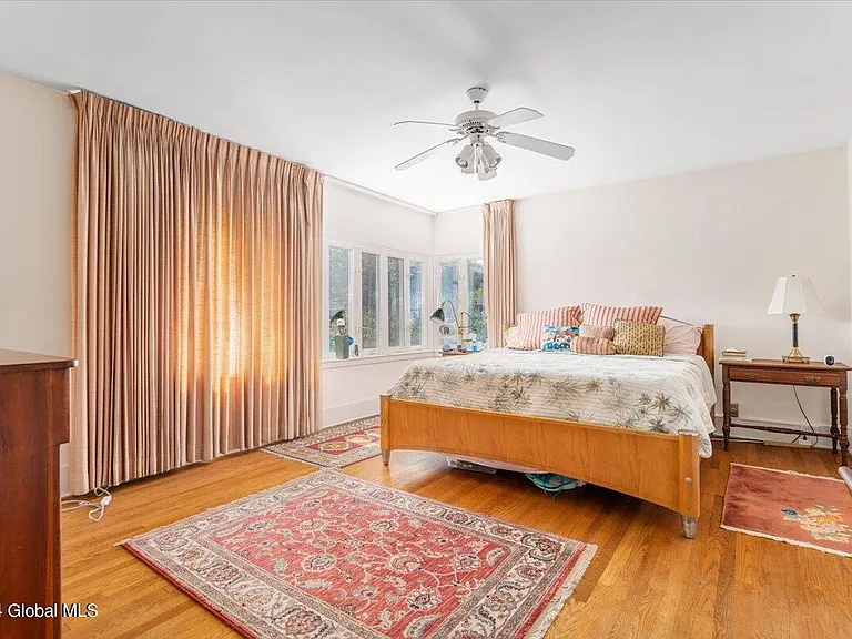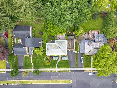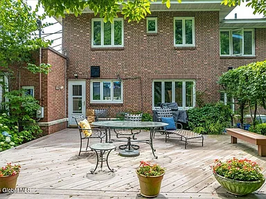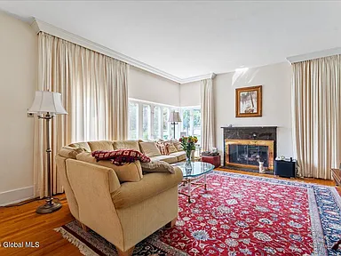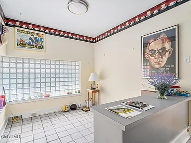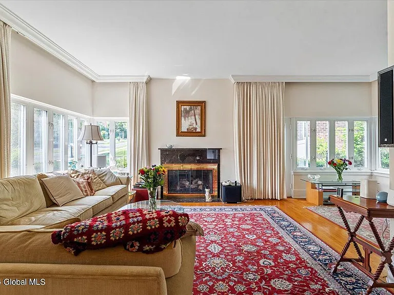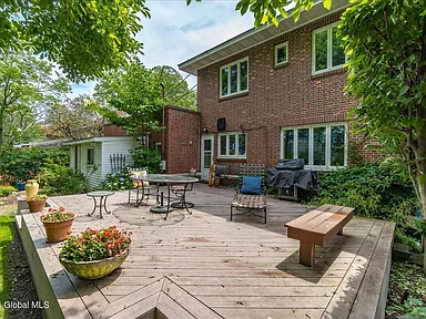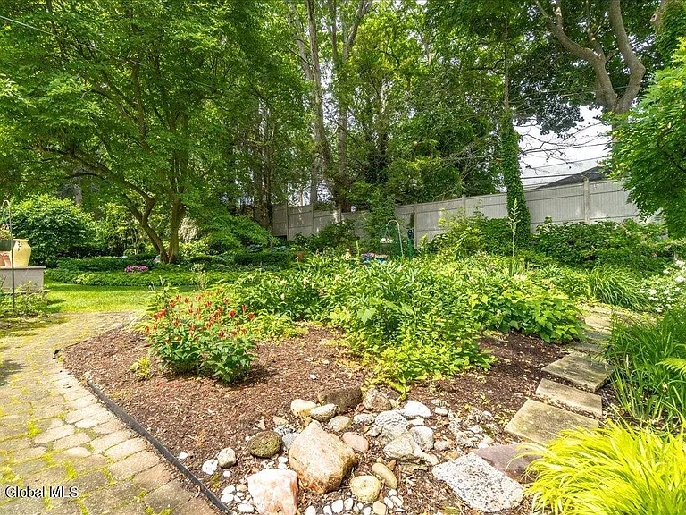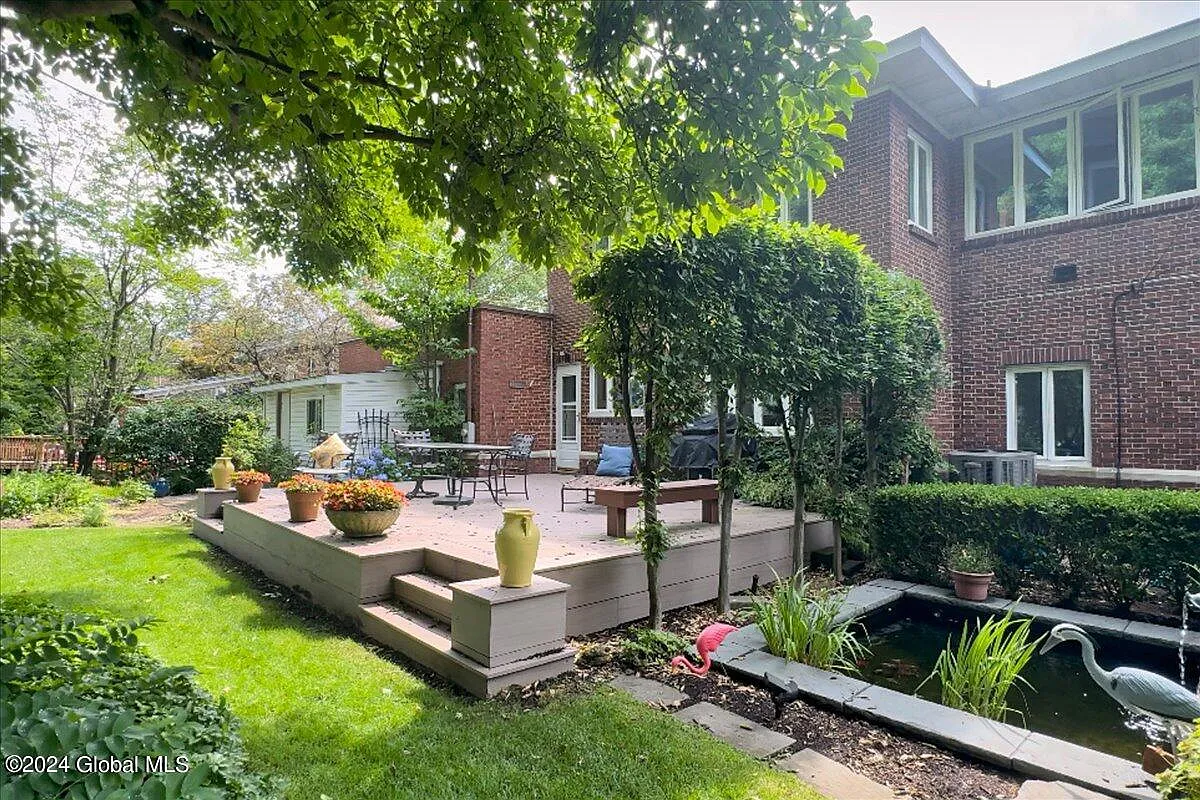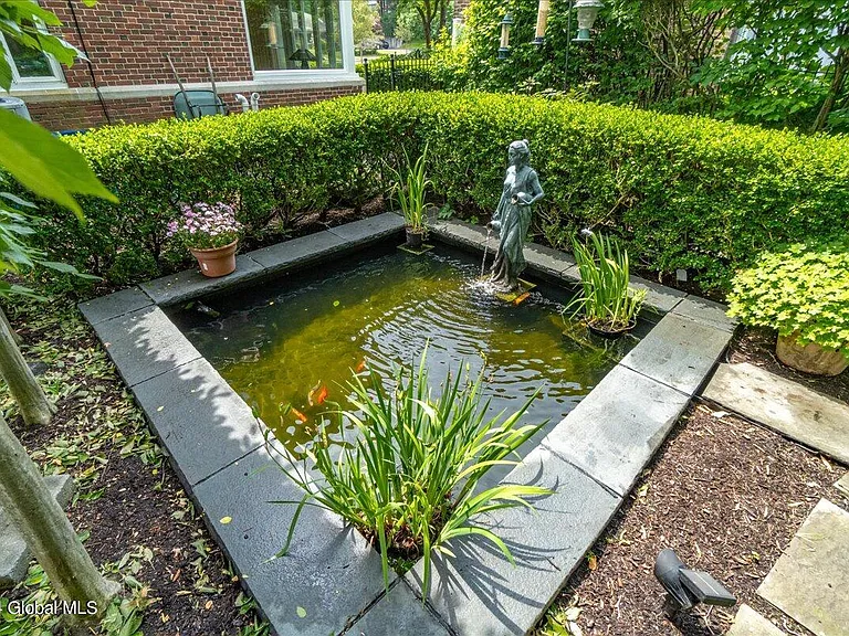 Welcome to 10 Marion Ave, a one of a kind architectural gem situated on a private lot w/stunning mature landscaping, enchanting backyard featuring koi pond with fountain and gorgeous plantings. Described by The Albany Preservation Society as 'International Style', Circa 1937 this brick home offers many art deco features including glass block wall, custom staircase, sunken living room, wrap-around windows, 4 bedrooms and study plus 3 1/2 baths. Primary suite w/updated bath. Hardwood floors throughout. Owner has original architectural drawings. This home exudes charm & character at every turn. In-ground sprinklers. Brand new central air conditioning system.