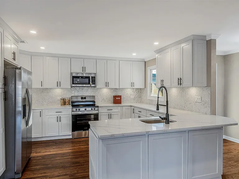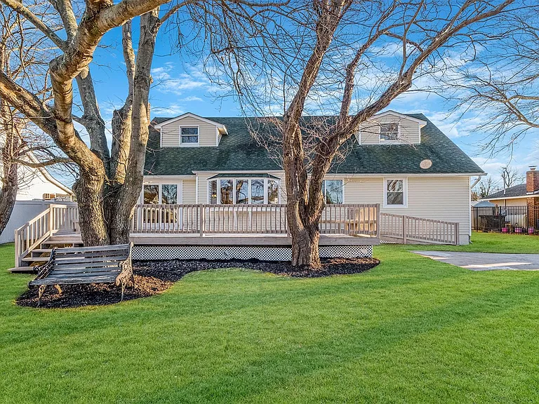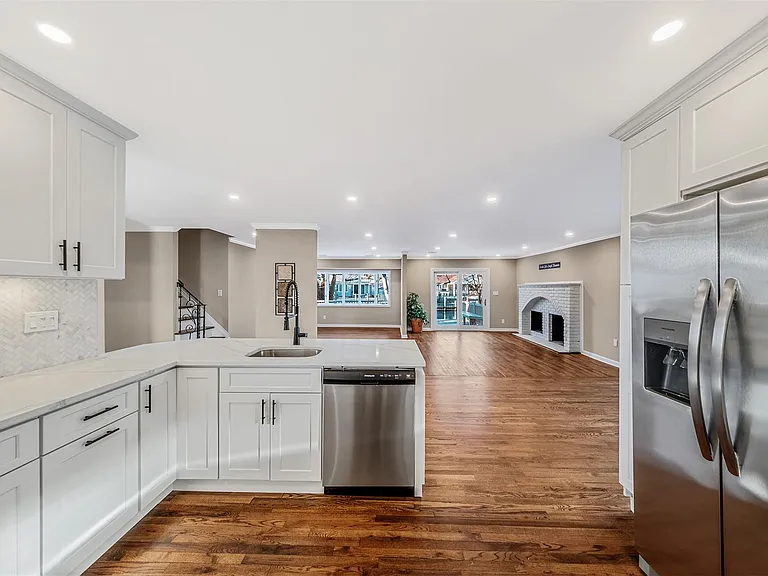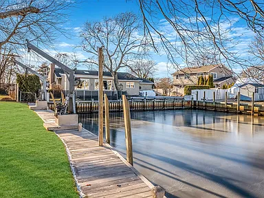 Welcome Home to your newly renovated waterfront oasis nestled South of Montauk Highway in the highly coveted Crystal Harbor community of Bergen Point. This stunning 5-Bedroom, 3-Full Bathroom designer Farm Ranch has a bright, open-concept floor plan filled with natural sunlight, making it perfect for entertaining or simply relaxing while taking in the tranquil water views. A true haven for boating enthusiasts, this home boasts approx. 90 feet of bulkhead, as well as additional deeded docking available. Cozy up by the wood-burning fireplace in the Living Room on chilly evenings or gather in the show-stopping kitchen which features elegant White Shaker Cabinets with sleek black hardware, Quartz countertops, a Marble Backsplash, and premium Stainless Steel Appliances. The main floor hosts a Living Room, Dining Room, Eat-in-Kitchen, Dining Area, Primary En-Suite, plus 2-additional bedrooms and full designer bathroom with a double vanity. Upstairs you will find 2 spacious bedrooms with walk-in closets and a full bathroom. This home is packed with updates, including gleaming hardwood floors, a new boiler, new central air conditioning, new vinyl siding, new windows, and 200 AMP electric service. The attached 1-car garage adds convenience to your daily lifestyle. Located just minutes to Babylon Village and the LIRR. Enjoy Town of Babylon beaches, pools, parks and golf courses. Short distance to the Bergen Point 18-hole golf course, fishing pier, shopping and restaurants. Your waterfront paradise awaits!